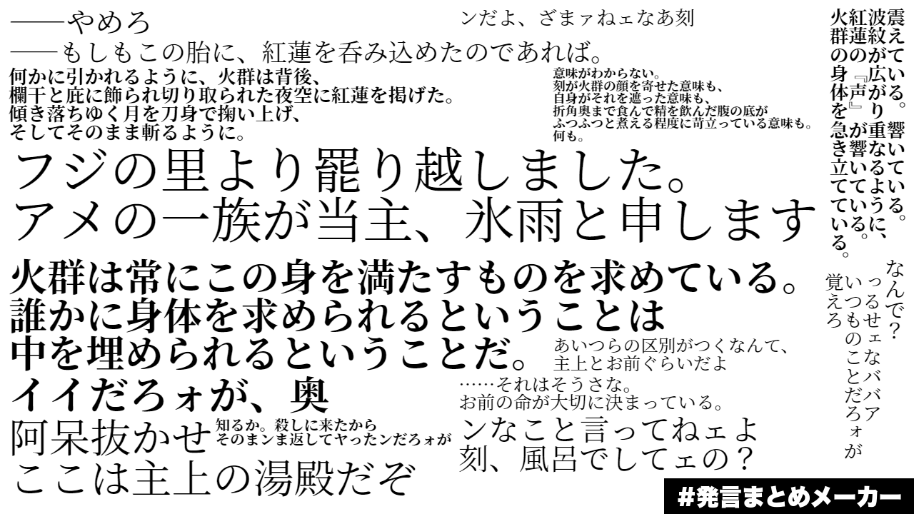 これで火群にどうしても満たされない虚を埋める方法としてセックスを教えたのも刻なので彼一人で地獄やってる。ぼちぼちいい歳で火群に夜ごと付き合ってるのはとてもえらい。